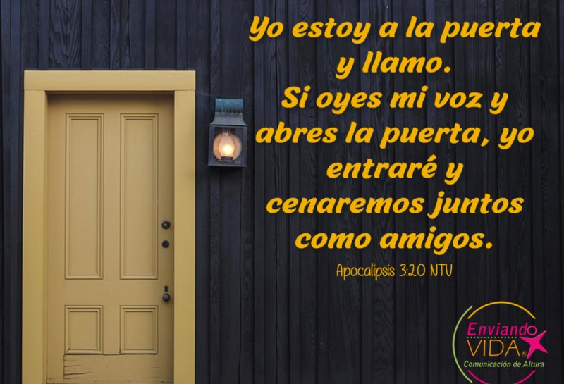"Yo estoy a la puerta y llamo. Si oyes mi voz y abres la puerta, yo entraré y cenaremos juntos como amigos" Ap. 3:20 NTV.